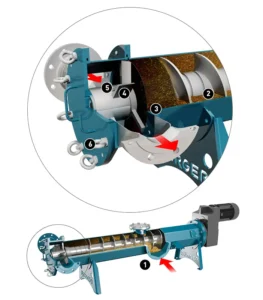 Биомасса подается через загрузочную воронку. Вал шнека Powerfeed переносит органические вещества, изнашивая и сжимая их по направлению к пресс-каналу. Пресс-канал ведет к промывочному узлу, подключенному к подающему трубопроводу. Комки, образующиеся в пресс-канале, обладают эффектом самообновляющегося уплотнения. Сырье изнашивается из-за своего расположения и типа пресса в Powerfeed, а также конструкции лопастей и дозирующего устройства. Благодаря этому они получают большую площадь поверхности при этом освобождая захваченный в процессе работы воздух.